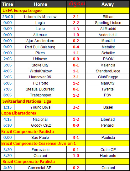ខាងក្រោមនេះលទ្ធផលបាល់ទាត់សំរាប់ថ្ងៃទី 16 ខែ កុម្ភៈ ឆ្នាំ 2012។