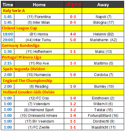 ខាងក្រោមនេះជាលទ្ធផលបាល់ទាត់សំរាប់ថ្ងៃទី 17 ខែកុម្ភៈ ឆ្នាំ 2012។
