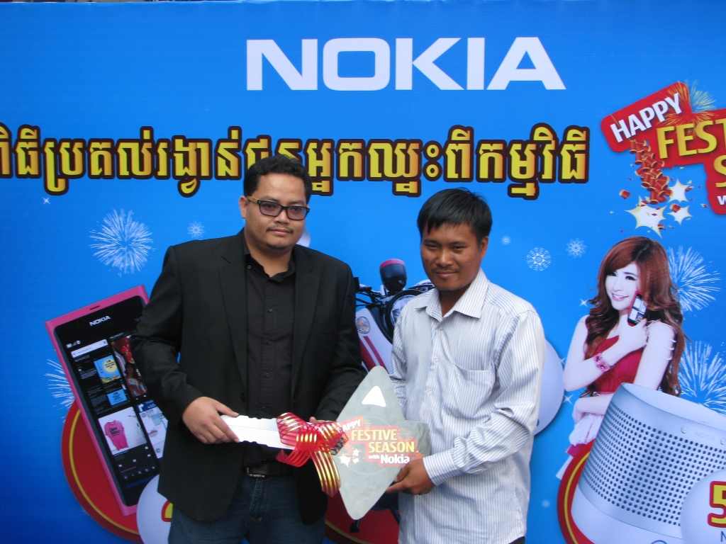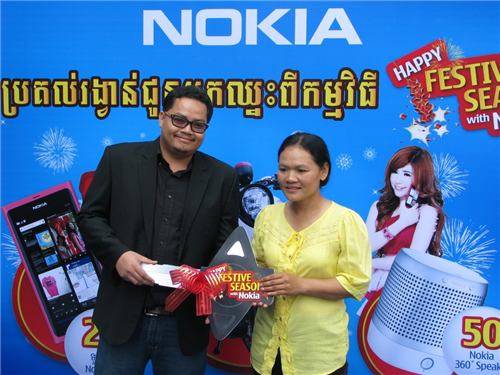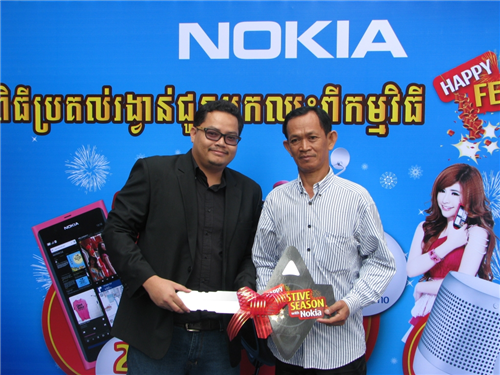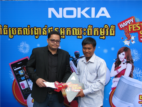 អតិថិជន ឈ្នះរង្វាន់ ក្នុងការចាប់រង្វាន់លើកទីមួយក្នុងកម្មវិធី Nokia Festive Season