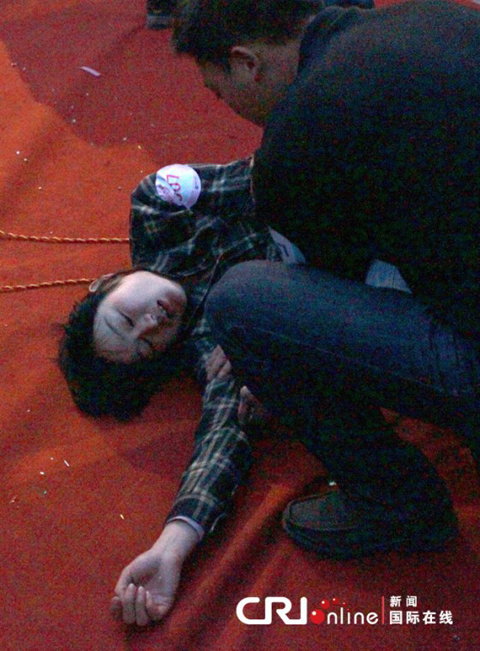 ត្រូវដួលដោយសារអស់កម្លាំង បុរសជាច្រើនបានប្រើដៃដើម្បីជួយទប់។