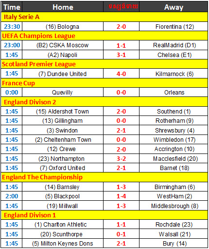 ខាងក្រោមនេះជាលទ្ធផលបាល់ទាត់