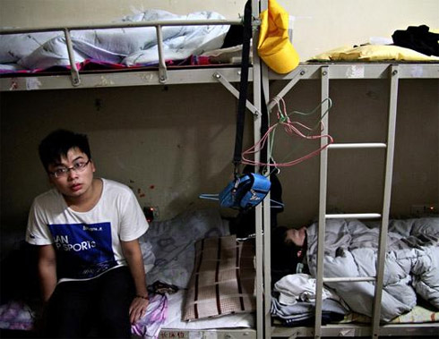 ៨នាក់មានទំហំតូចចង្អៀតជាមួយគ្រែដេកជាថ្នាក់ៗតំរួតលើគ្នា។ Foxconn ធ្លាប់ត្រូវបានរង