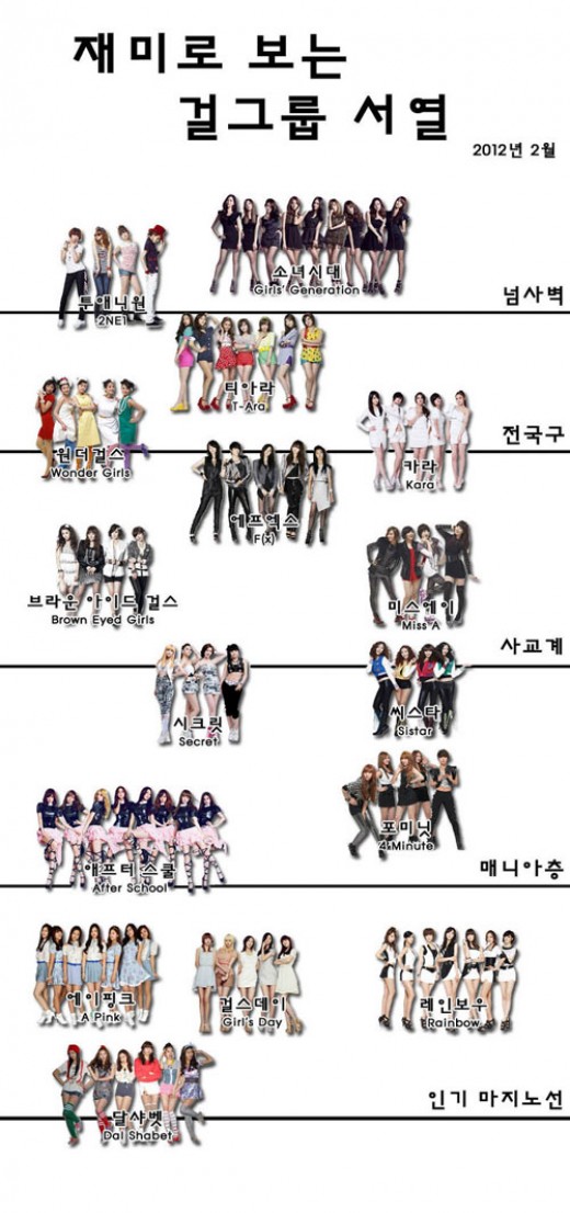 ក្រុមអ្នកវាយតម្លៃ K-pop លើប្រព័ន្ធ Internet មួយបានបង្កើតជាតារាងរាយចំណាត់ថ្នាក់ Girl Bands ដែលបានបង្ហោះតាម Internet ហើយតារាងចំណាត់ថ្នាក់នេះបានក្លាយជាព័ត៌មានមួយដ៏គួរអោយចាប់ អារម្មណ៍។