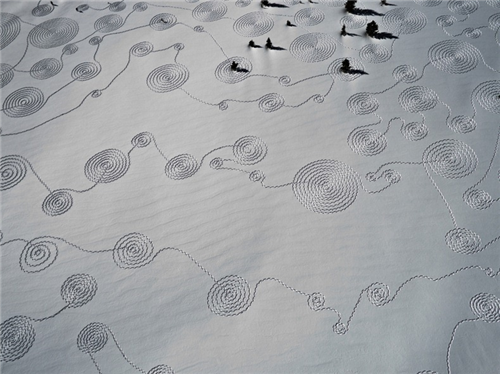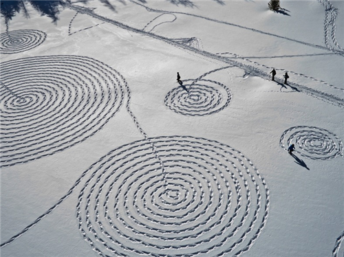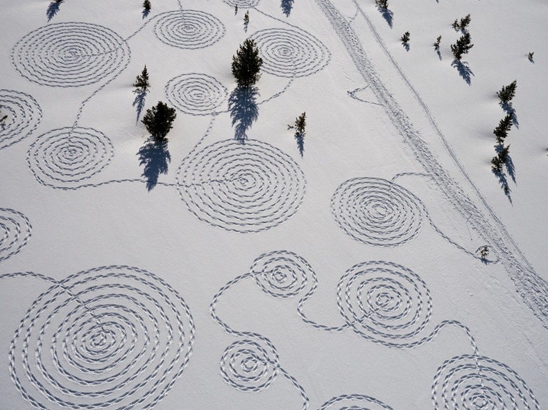 លោកស្រី Sonja Hinrichsen ជាមួយសហការីស្ម័គ្រចិត្ត៥នាក់បានរួមគ្នាបង្កើតគំនូលើផ្ទាំងព្រិលខាងលើជាមួយនឹងស្បែកជើងដើរលើព្រិល នៅលើភ្នំ Rocky Mountains លោកស្រី Hinrichsen អាយុ៤៤ឆ្នាំបាន បញ្ចប់ថ្នាក់សិក្សាផ្នែកសិល្បះកាលពីឆ្នាំ១៩៩៩ពីវិទ្យាស្ថាន San Francisco Art ហើយលោកស្រីមានការចាប់អារម្មណ៍ជាខ្លាំងទៅលើដានជើងសត្វដែលដានជាប់នឹងព្រិលតាមវាលរាបជើងភ្នំហេតុនេះហើ យ ទើបលោកស្រីមានគំនិតបង្កើតសិល្បះខ្នាតយក្សនេះឡើងមក។ លោកស្រីក៏បានមានប្រសាសន៍ប្រាប់ផងដែរថា �ការគូររូបលើព្រិលដោយប្រើជើងនេះមិនមែនជាការងាយស្រួលទេហើយក៏មិនមែនប្រើប្រាស់ពេលតិចដែរវាអាចប្រើ ពេលរាប់ម៉ោងឬច្រើនថ្ងៃផង�។
