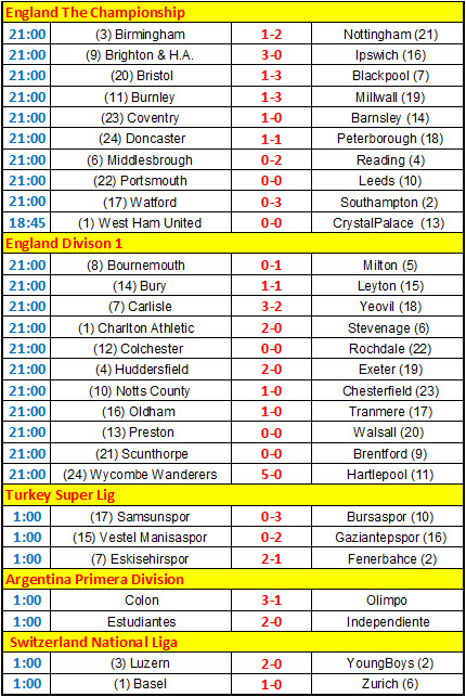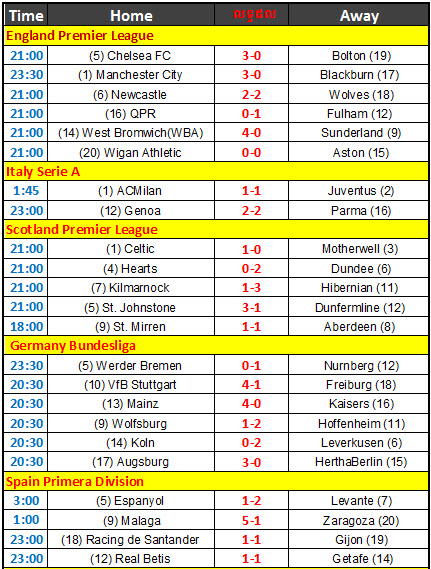 កាលពីយប់មិញនេះមានការប្រកួតរវាងក្រុម Chelsea ជាមួយនឹងក្រុម Bolton ដោយ Chelsea បានយកឈ្នះនៅក្នុងទឹកដីរបស់ខ្លួនរហូតដល់ទៅ 3 ទល់នឹង 0។ ក្រឡេកទៅមើល Manchester City វិញដែលបានប្រកួតជាមួយនឹង Blackburn កាលពីវេលាយប់មិញដូចជាគ្នា ដោយ Manchester City ក៏បានយកឈ្នះនូវពិន្ទុ 3 ទល់នឹង 0 ផងដែរ។ ចំនែកឯលទ្ធផលក្រុមដ៏ទៃទៀតសូមមើលតារាងខាងក្រោមនេះ៖
