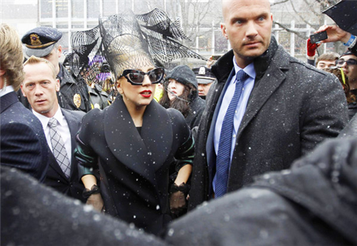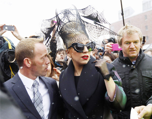 នាងបានដើរចេញពីរថយន្តជាមួយនឹងអាវធំពណ៌ខ្មៅមួករាងចម្លែកដែលជានិមិត្តសញ្ញារបស់