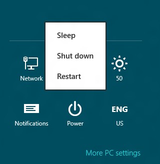 ដើម្បីបិទ រឺក៏ Restart ឡើងវិញនូវ Windows 8 នេះ ,ក៏តំរូវអោយចូលទៅកាន់ menu Setting ខាងលើនេះផងដែរ គឺជ្រើសយកពាក្យ Settings -> Power -> Shutdown (រឺ Restart ) ។