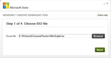 -បន្ទាប់ពីដំឡើងរួចរាល់ហើយ បើកកម្មវិធី Windows 7 USB/DVD Download Tool ឡើង។ បន្ទាប់មកត្រូវចុចលើ Browser រួចស្វែងរកឈ្មោះ file iso របស់ Windows 8 ដែលបានទាញ