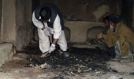 ផេះ និងស្នាមឈាមនៅកន្លែងកើតហេតុ។