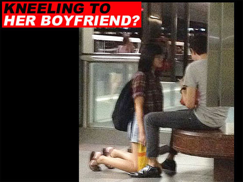ដែលលុតជង្គង់នោះស្លៀកពាក់ទាន់សម័យ និងដូចជាស៊ីវីល័យ ខណៈដែលមិត្តប្រុសរបស់