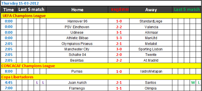 រាត្រីថ្ងៃព្រហស្បតិ៍នេះ មានក្រុម Athletic Bilbao ដែលជាម្ចាស់ផ្ទះ បានស្វាគមន៍ ក្រុមManchester United ដែលជាភ្ញៀវ។ បើយោងទៅតាមការទស្សន៍ទាយក៏បាន ទាយថា Manchester United បានយកឈ្នះ Athletic Bilbaoនូវពិន្ទុ ៣ ទល់នឹង ១។ ចំនែកឯក្រុម Manchester City ជាម្ចាស់ផ្ទះ ជួបជាមួយនឹងក្រុម Sporting Lisbon ដែលជាភ្ញៀវ។ តែបើយោងទៅតាមការទស្សន៍ទាយគឺក្រុម Manchester City អាច យកឈ្នះក្រុម Sporting Lisbon នូវពិន្ទុ ៣ ទល់នឹង ០។ ចុះប្រិយមិត្ត Camenws វិញ អាចទស្សន៍ទាយបានទេថាក្រុមណា ដែលជាក្រុមឈ្នះក្នុងរាត្រីយប់ថ្ងៃព្រហស្បតិ៍នេះ? ខាងក្រោមនេះជាតារាងក្រុមប្រកួតរបស់ក្រុមដ៏ទៃទៀត៖