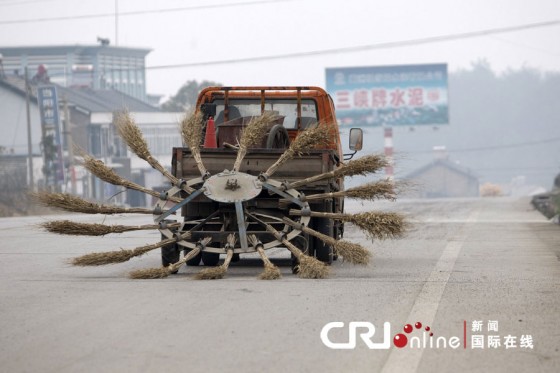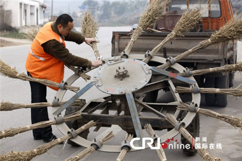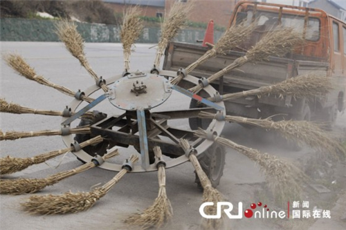 ខែត្រHubei ប្រទេសចិន។ ម៉ាស៊ីនបោសថ្នល់ដែលភ្ជាប់ជាមួយនឹងរថយន្ត នេះផ្គុំពីអំបោស