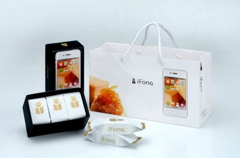 នំផ្អែម iFong ជាមួយប្រអប់ផ្ទុកមើលទៅដូចជាប្រអប់សំរាប់ដាក់ iPhone ពណ៌ស