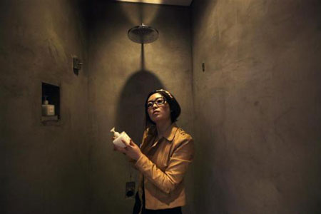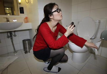 ចិន។ ក្នុងរួបភាព Zhuang កំពុងពិនិត្យបរិយកាស វត្ថុធាតុនៅក្នុងបន្ទប់ទឹករបស់សណ្ឋាគារ។