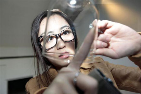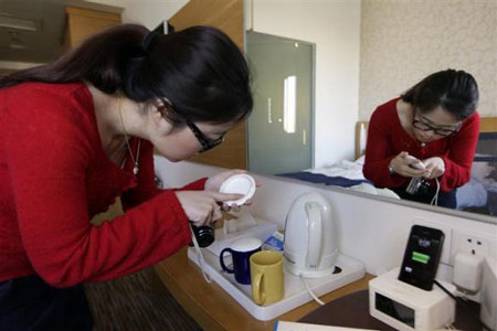 Zhuang កំពុងពិនិត្យកែវរបស់សណ្ឋាគារ។