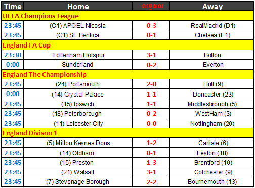 តារាងលទ្ធផលបាល់ទាត់សំរាប់ថ្ងៃទី ២២ មិនា ២០១៣