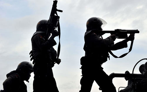 កម្លាំងនគរបាលប្រឆាំងបាតុកម្មបំពាក់ដោយឧបករណ៍ការពារគ្រាប់ ដំបងឆក់ ព្រមទាំង