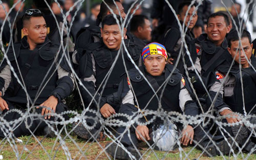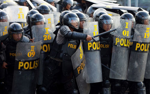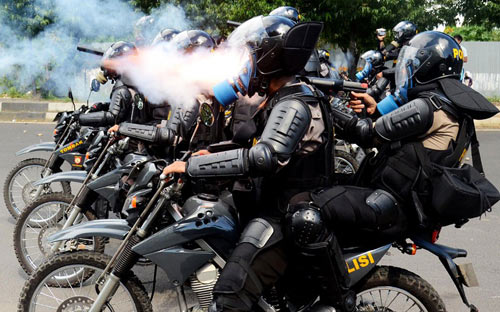 កងកម្លាំងប្រឆាំងបាតុកម្មប្រើប្រាស់ម៉ូតូជំនាញបំបែកក្រុមបាតុករនៅ Makasar។ កាំភ្លើង