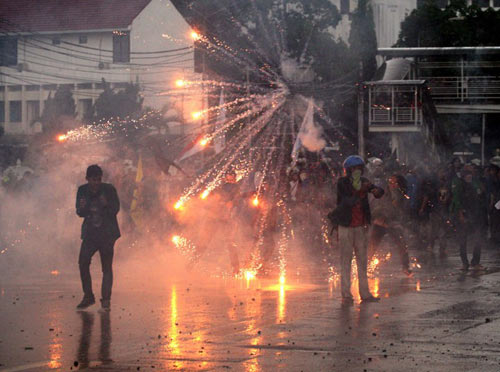 ក្រុមនិស្សិតដែលចូលរួមក្នុងបាតុកម្មនេះ បានគប់ដបសាំងភ្លើងទៅកាន់កងនគរបាលនៅ