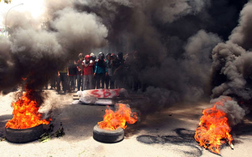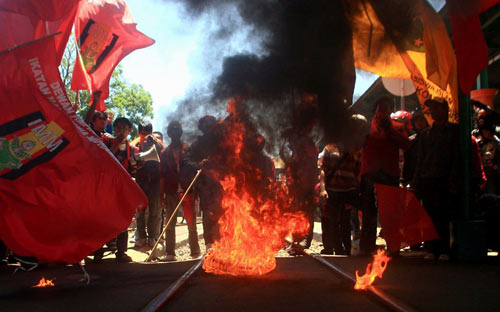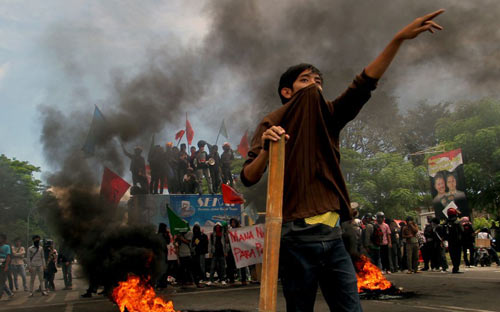 ភ្លើងកំពុងឆេះនៅតំបន់ Makassar លើកោះ Sulawesi នៅពេលនិស្សិតធ្វើបាតុកម្ម។ ប្រសិន