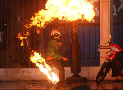 ដបសាំងភ្លើង ត្រូវបានបាតុករម្នាក់នៅក្រុង Jakarta ប្រើប្រាស់។ ចាប់តាំងពីបាតុកម្មនៅ