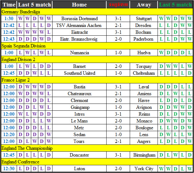 តារាងការប្រកួតបាល់ទាត់ថ្ងៃទី 30-03-2012