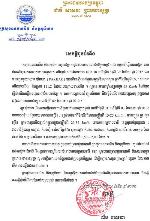 ខែមេសា ខាងមុខ ប្រទេសកម្ពុជានឹងទទួលរងនូវឥទ្ធិពលព្យុះមួយឈ្មោះ ប៉ាកហា ដែលបាន