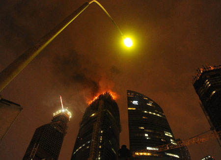 ដែលកំពុងឆាបឆេះនៅលើដំបូលនៃអាគារខ្ពស់កប់ពពកមួយ ដែលកំពុងត្រូវបានសាងសង់